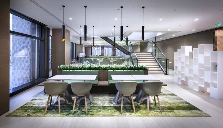 清透的玻璃和充滿生機的綠植墻打造的步行樓梯,以此鼓勵內(nèi)部人員的流動。同時周邊開放的設(shè)計意在創(chuàng)建一種基于動態(tài)的工作模式(ABW),通過協(xié)作空間將人們聚集在一起。