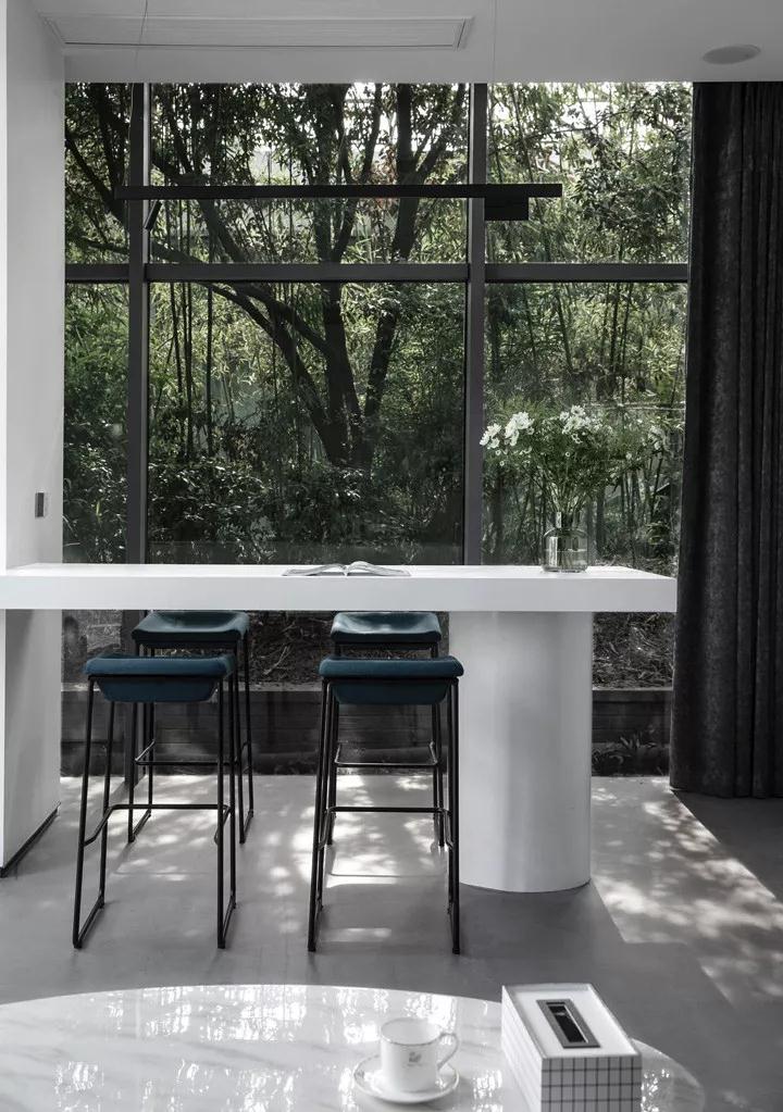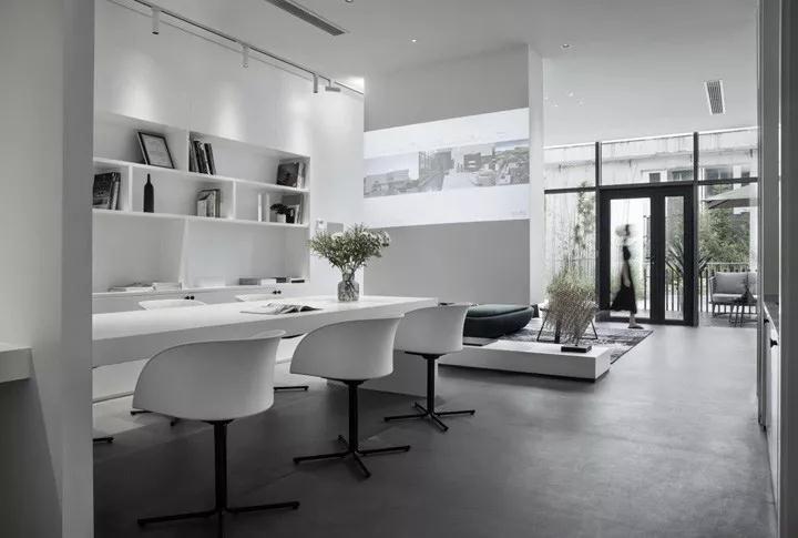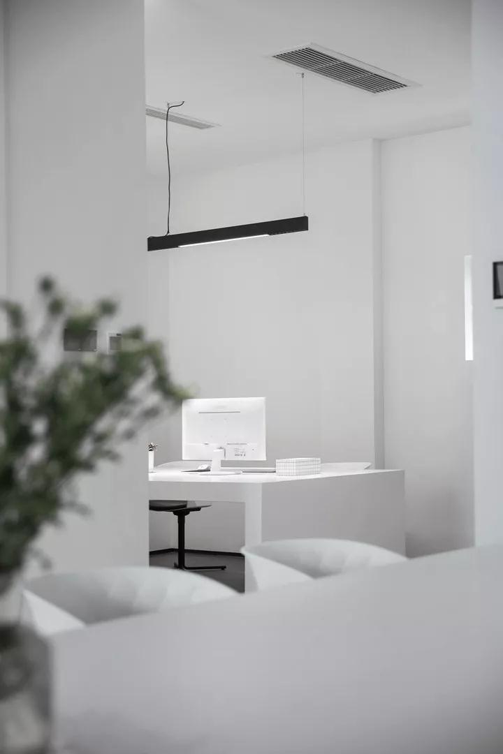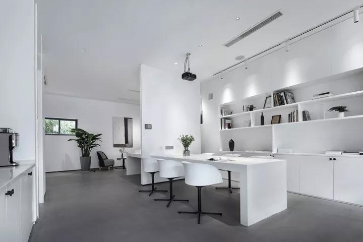 在色彩上,回歸對“無”的一種思考。設計需要一種克制的色彩,而且充滿張力和想象力。在豐富多彩的世界里,白色最接近內心,最為尊貴,也許是最絢麗多彩的顏色。設計師選擇了白色,白色的天花,白色的墻面,白色的家具,少許低飽和度的綠色統一在灰色水泥地面中,形成對比,促進著情緒和情感的激發(fā)。