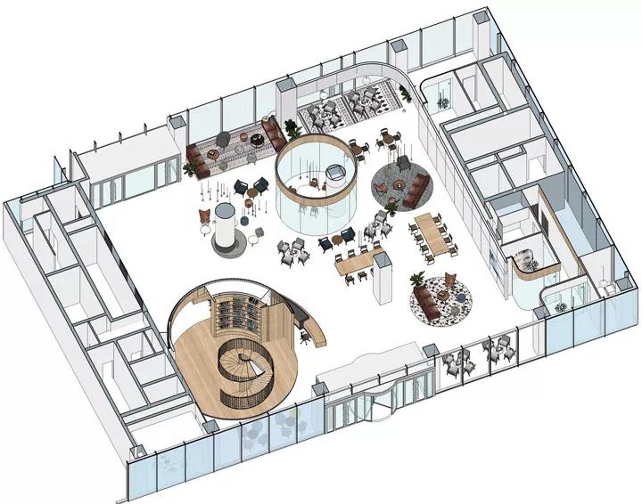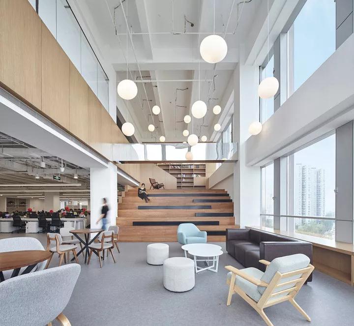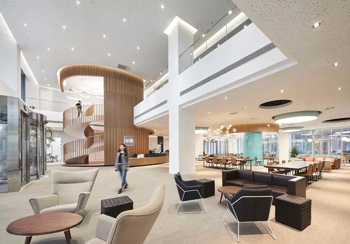 都市客廳島,選擇流暢線條的螺旋樓梯貫穿上下,運(yùn)用條形面板錯(cuò)縫排列成弧形的照明方式,使整個(gè)空間照度均勻,且條形面板亦可作為裝飾展示面。家居軟裝選用極簡(jiǎn)風(fēng)格,流線組擺方式,營造自由靈活的空間,促進(jìn)員工間的交流和溝通。美不止于外在,更追求內(nèi)心。心靈之約—圖書閱讀區(qū)。木飾面板大樓梯,高懸掛的裝飾燈,營造出安靜舒適的閱讀氛圍,同時(shí)也可以作為小型沙龍或讀書分享活動(dòng)場(chǎng)所。