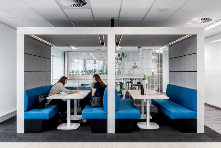 咖啡吧以戰略性的布局介于董事會議室和協作區之間,移動門和百葉窗使其能夠打開形成大型娛樂和聚會空間?;蛘撸瑖掀饋硇纬尚⌒蛨F隊培訓班和講習班。工作區一旁是一排寧靜的“船艙”,讓人聯想起甲板上的布局。每個小木屋的門外都有一個指示燈,顯示房間是否正在被占用,,人們就能快速找到空房間來打私人電話。