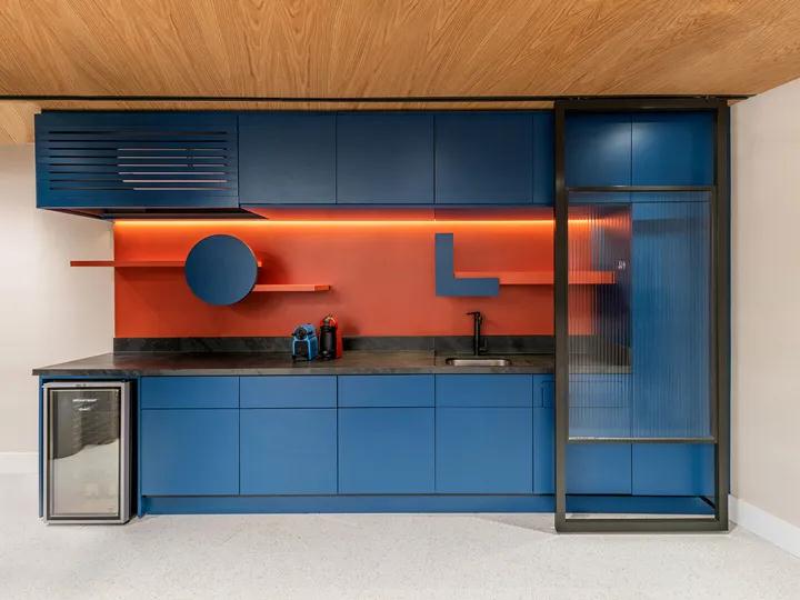 空間的感官體驗也是這種情況的重點。藍色的入口走廊構成了項目的設計主題和全新的愿景。為了營造一種具有集體意識的平等工作環(huán)境,采用了開放式的綜合布局。可移動的面板和窗簾在必要時可確保隱私。在入口門廊旁邊,設計了一個展示柜,以展示最新趨勢。
