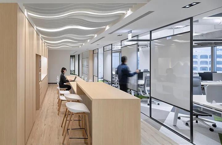 作為一家創(chuàng)新的生物制藥公司,該公司繼續(xù)為員工創(chuàng)造更好的工作環(huán)境,以幫助激發(fā)他們的創(chuàng)造力。在辦公室設(shè)計(jì)的空間中,深圳裝飾公司的設(shè)計(jì)師希望讓員工享受下班后的郊游樂趣。因此,自然元素被移到室內(nèi)。結(jié)合深圳山脈的影像,傳統(tǒng)的竹編織和浮雕玻璃,人們可以在辦公室里欣賞曲折的云海和縱橫交錯(cuò)的稻田。同時(shí),深圳裝飾公司通過模糊和重疊空間邊界,在視覺和功能方面放大并擴(kuò)展了原始的狹窄空間。開放式辦公室區(qū)域分為綠色植物,并通過靈活的移動(dòng)線連接。可以有效利用空間而不會(huì)失去活力,山區(qū)如咖啡區(qū)使用的材料也接近自然。山形的裝飾墻取材于回收咖啡豆制成的水泥板,再加上天花板的波浪形吸音吊板,加上柔和的燈光,在云霧之中營(yíng)造出一個(gè)休閑空間山。