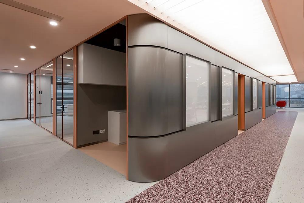 打造全新的辦公裝修空間。雙方合作設計,傳遞前沿時尚態度,定義未來科技驅動的辦公方式,整體設計是一個線性空間,三邊由高玻璃隔開包裹。深圳裝飾公司形成了秩序井然、合作便捷的辦公氛圍。設計試圖在一系列弧度和曲面的表現與工業風格的硬朗質感之間創造一種平衡感。中央走道的設計實現了迎賓和引導視線沿空間延伸的雙重功能。天花板是長條形拉伸膜光幕,外部裝飾有一層玻璃網格,與深紅色橢圓形乙烯基底座裝飾相反。深圳裝飾公司拉絲不銹鋼墻板外嵌有滑動白板和留言板,方便辦公室裝修設計過程中的合作??拷肟诘娜g會客室和前臺均采用漸變長虹玻璃,顏色由粉色過渡到透明。會議室的墻壁是柔和的粉紅色,深圳裝飾公司嵌入了不對稱裝飾板,天花板是橢圓形透明膜,地面是深藍色的德嘉地板。接待區和辦公區由弧形黑框不銹鋼穿孔板屏風隔開。屏幕鏤空圖案的大小由下至上逐漸設計,既保護隱私又保證視野內的廣闊視野,空間四周環繞著會議室、印刷室、茶室和一些安靜的角落,周圍環繞著珊瑚色的金屬屏風。
