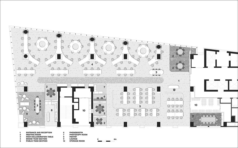 深圳裝飾公司上述空間的內部和天花板也延續了屏幕元素,與裸露的混凝土天花板形成對比。茶室里有一個由卡拉白大理石制成的波浪島。休息室的地板是軟木地板,擺放著一張質感很強的定制大理石長桌。衛生間的家具都是人造家具??臻g內規劃了可容納100人以上的培訓室、直播室、會議室等多個功能空間。墻壁設計不同:有些是木條,有些是波浪形布墻板。
