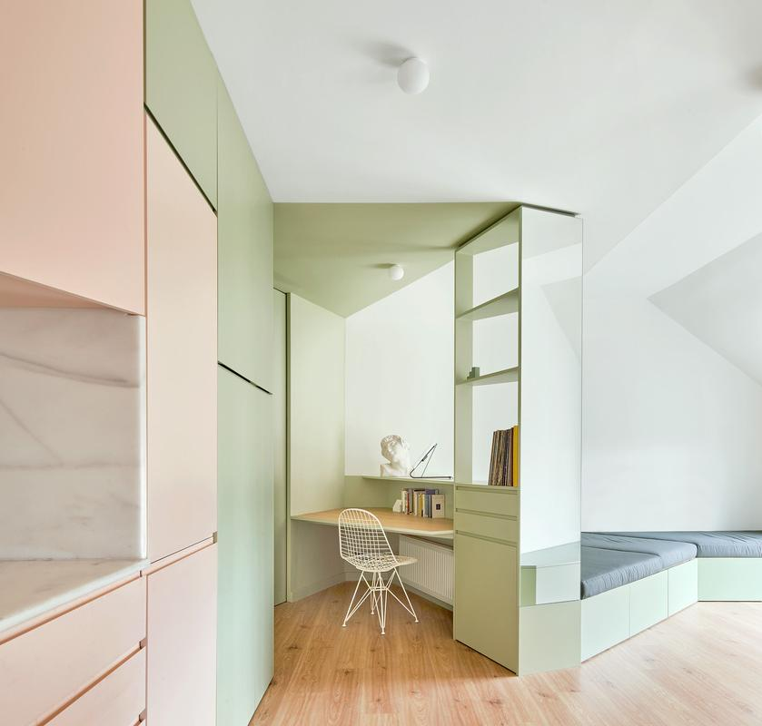 清新的綠轉為優雅的粉,就到了開放式廚房,界限感十分柔和。